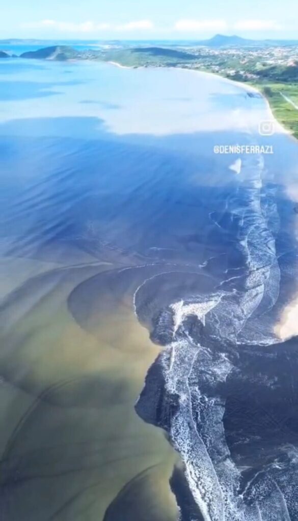 📷 Imagem aérea de Denis Ferraz mostra a mancha escura saindo da foz do Rio Una, em Cabo Frio, e avançando pelo mar em direção ao litoral de Búzios.